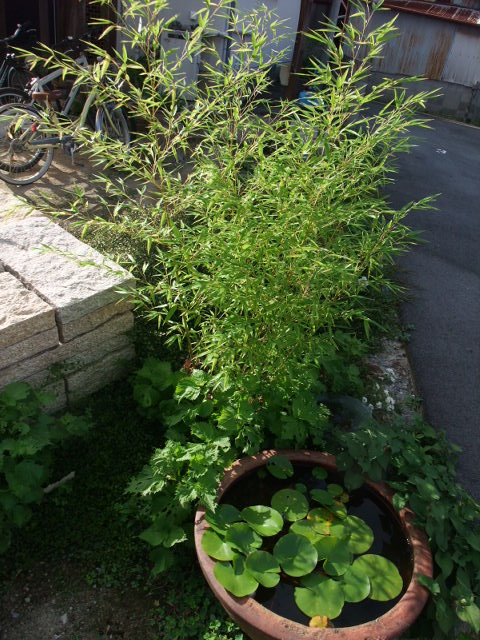 玄関脇のメダカ鉢と笹