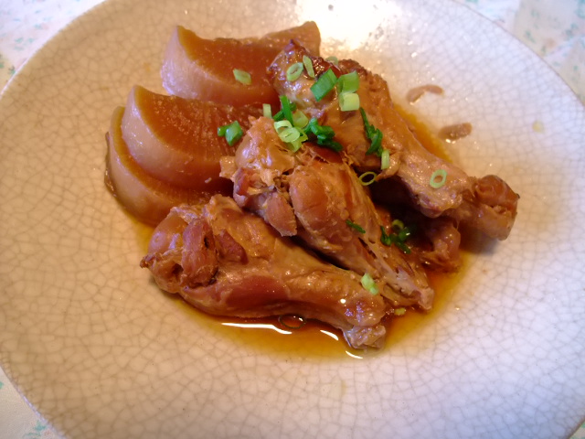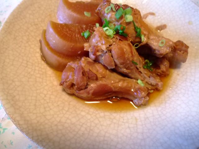天然マダイの頭を大根と煮てイカの唐揚げと